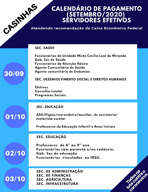 A prefeitura Municipal de Casinhas iniciou nesta quarta feira dia 30/09, o pagamento dos servidores Municipais. O cronograma visa estabelecer uma organização no pagamento dos funcionários e estabelecer fluxo na economia do Município. De acordo com a tabela abaixo o funcionário pode conferir a ordem dos pagamentos de acordo com cada secretária: