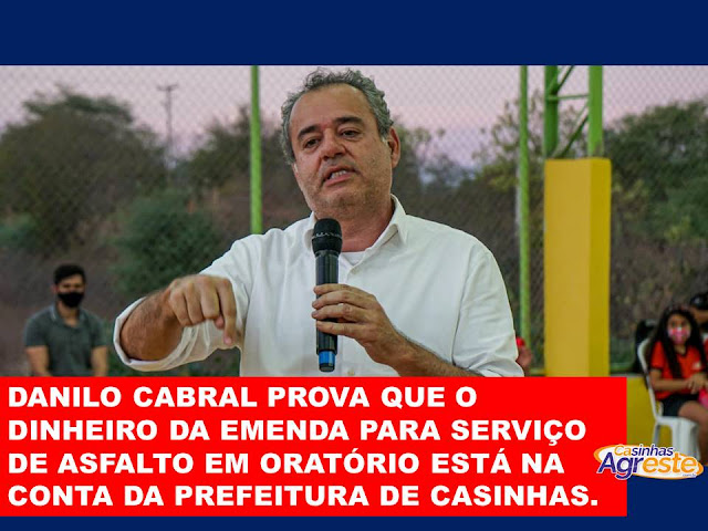 O Deputado Federal Danilo Cabral (PSB) se posicionou em suas redes sociais sobre os recursos enviados para a Prefeitura Municipal de Casinhas em relação a uma emenda parlamentar de sua autoria que vai beneficiar o distrito de Oratório com camada asfáltica. O Parlamentar afirmou que o dinheiro já está na conta da Prefeitura.